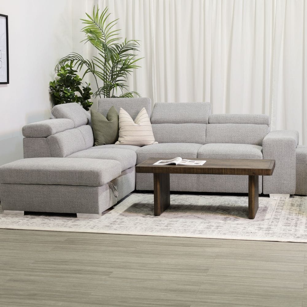 The Pamina Sectional is a versatile and stylish piece of furniture that offers both comfort and functionality. This sectional features a pull-out drawer style bed, perfect for accommodating guests or as a comfortable place to lounge. The sectional also includes storage, so you can keep your space organized and clutter-free. To add even more comfort and versatility, the Pamina comes with extra ottomans that can be used as additional seating or as a footrest. The adjustable headrests allow you to customize the sectional to your preferred level of comfort. The Pamina is available in two different colours, giving you the option to choose the one that best fits your decor. Upgrade your living space with the Pamina Sectional.Read More