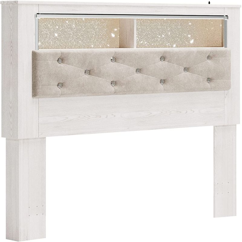 The epitome of fashion-forward design, this queen upholstered bookcase headboard is a beautiful blend of comfort and luxury. Shiny chrome-tone accents, a pearlized finish and button-tufted upholstery bring a glam touch to the richly rustic appearance. Remote-controlled LED lighting adds style and modern convenience to your restful retreat. Light finish with subtle pearl effect over replicated cedar grain and authentic touch.