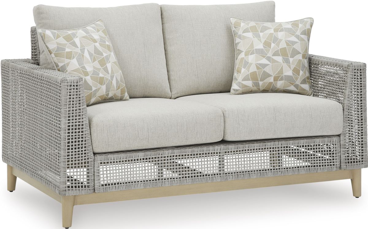 This loveseat invites your casual contemporary style outdoors. With its resin wicker in a chic neutral hue, it expertly marries refined design with durability. Breezy summer mornings and cold winter nights are made all the more comfortable with high-performance Nuvella+ fabric covering the cushion.Read More
